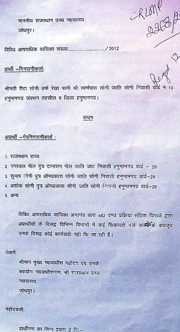 रीटा सोनी उर्फ रेखा निवासी नजदीक दुर्गा मंदिर,वार्ड नं 13 हनुमानगढ़ ने राजस्थान उच्च न्यायालय जोधपुर में विविध अपराधिक याचिका सं 2268-2012 धारा 482 दंड प्रक्रिया संहिता के तहत दिनांक 12 सितम्बर 2012 को कोर्ट नं 12 में लगाई। न्यायाधीश निर्मलजीत कौर ने 28 सितम्बर को रीटा का पक्ष सुना।