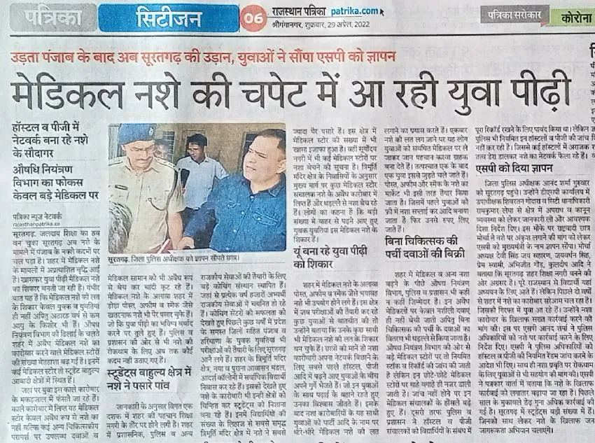 सूरतगढ़ में नशा स्मैक फैलने और उस पर अंकुश लगाने की एक बड़ी रिपोर्ट राजस्थान पत्रिका श्रीगंगानगर के संस्करण में 29 अप्रैल 2022 को छपी। एक दिन पहले 28 अप्रैल को जिला पुलिस अधीक्षक आनंद शर्मा सूरतगढ़,आए और उन्होंने पुलिस उप अधीक्षक शिवरतन गोदारा और सिटी थाना अधिकारी सीआई रामकुमार लेघा से अपराधों बाबत बातचीत की जानकारी ली,तब उसी दिन राष्ट्रीय छात्र मोर्चा ने स्मैक नशा फैलने और उसे रोकने की मांग की।