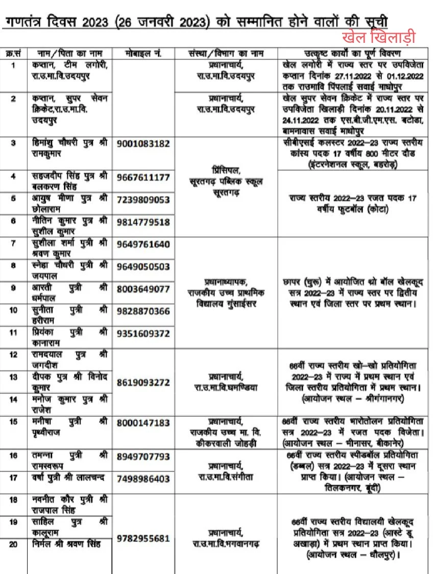 गणतंत्र दिवस समारोह उपखंड स्तरीय में 26 जनवरी को विशिष्ट कार्य करने वाले सरकारी कर्मचारियों,समाज सेवा के कार्यों में लगे विभिन्न संस्थाओं के अध्यक्षों, और खिलाड़ियों को सम्मानित किया जाएगा।